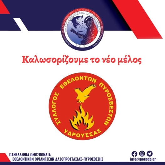 Με ιδιαίτερη χαρά, η Πανελλήνια Ομοσπονδία Εθελοντικών Οργανώσεων Δασοπροστασίας Πυρόσβεσης ανακοινώνει την ένταξη του Σύλλογος Εθελοντών Πυροσβεστών Υδρούσσας ” Ο Διόνυσος “ ως νέο μέλος της.